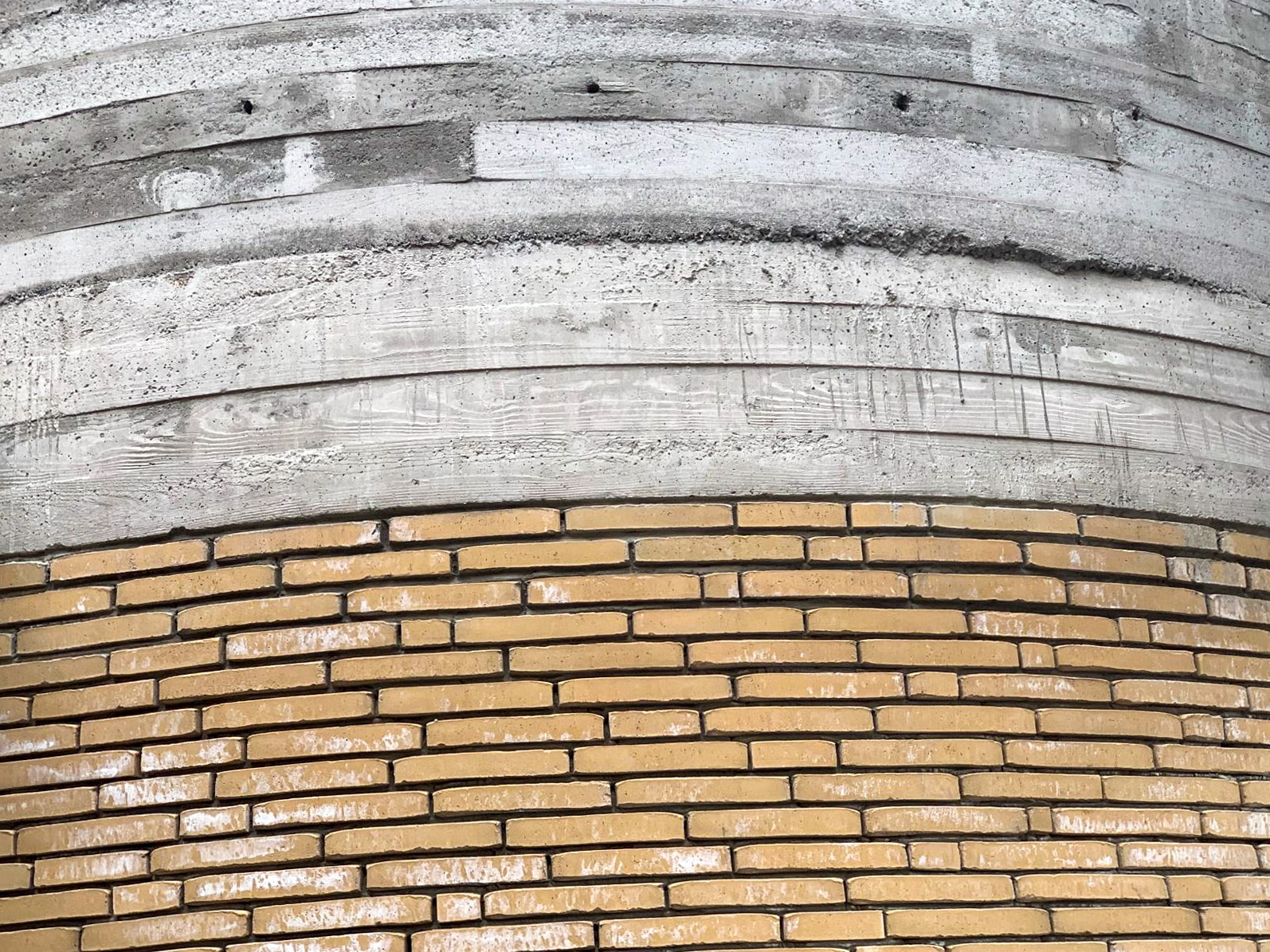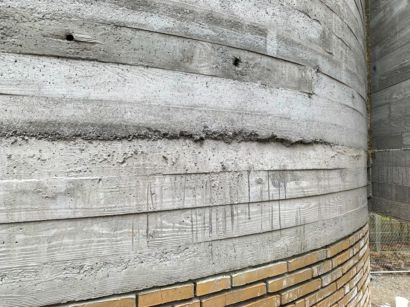 De ronde betonwand met plankenbekisting vertoonde oneffenheden en uitlopende naden. We herstelden en werkten de boogwand zorgvuldig af zodat het beton opnieuw strak en egaal oogt, met behoud van het bekistingseffect.