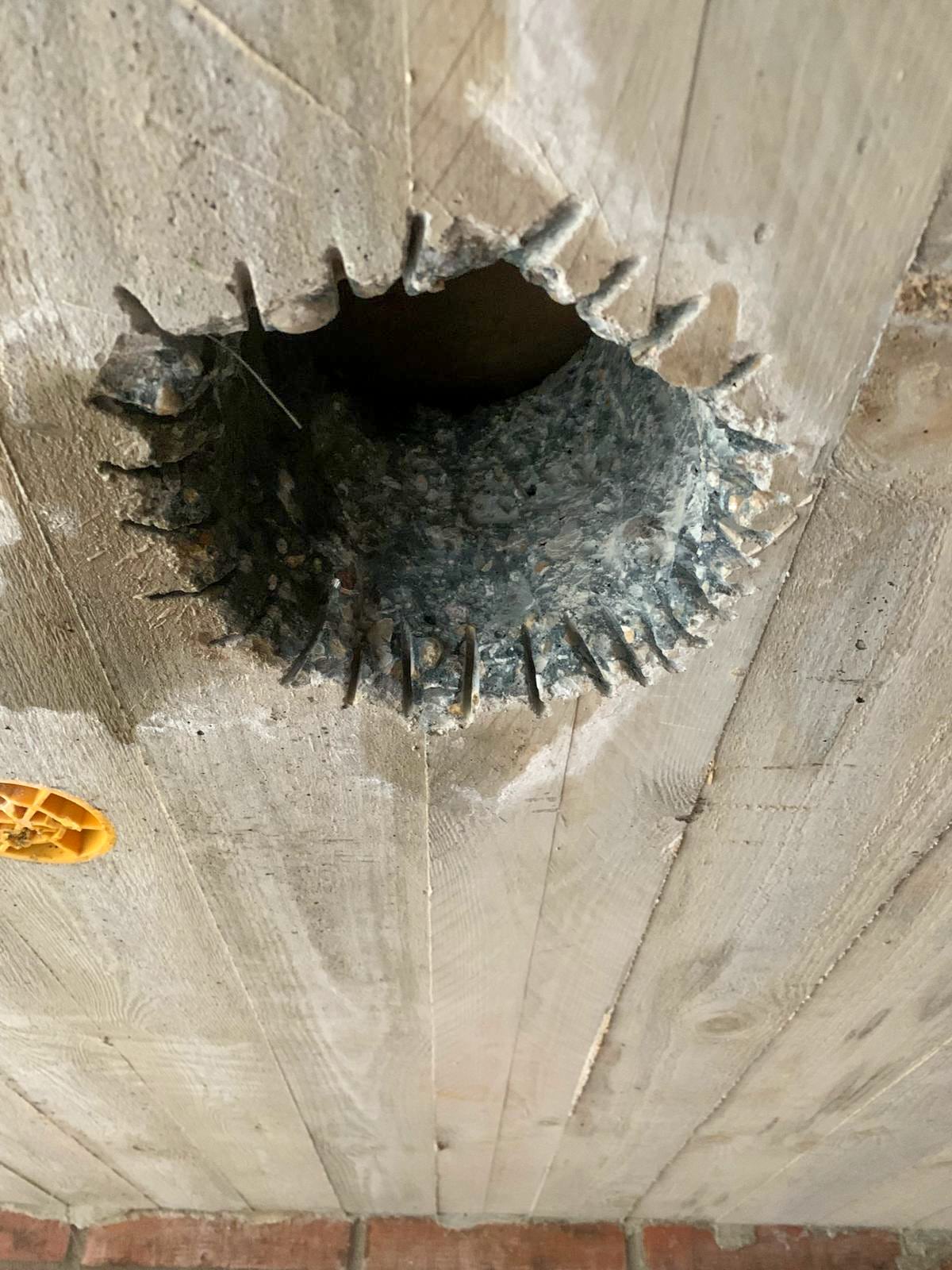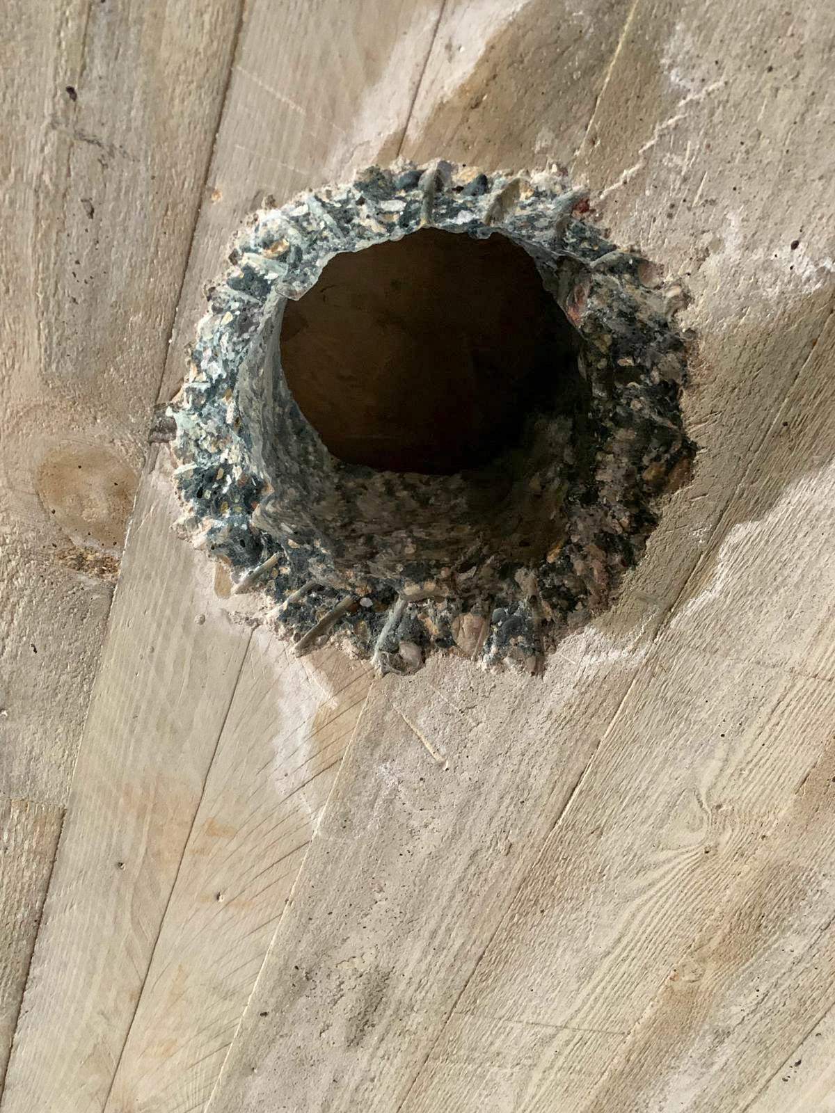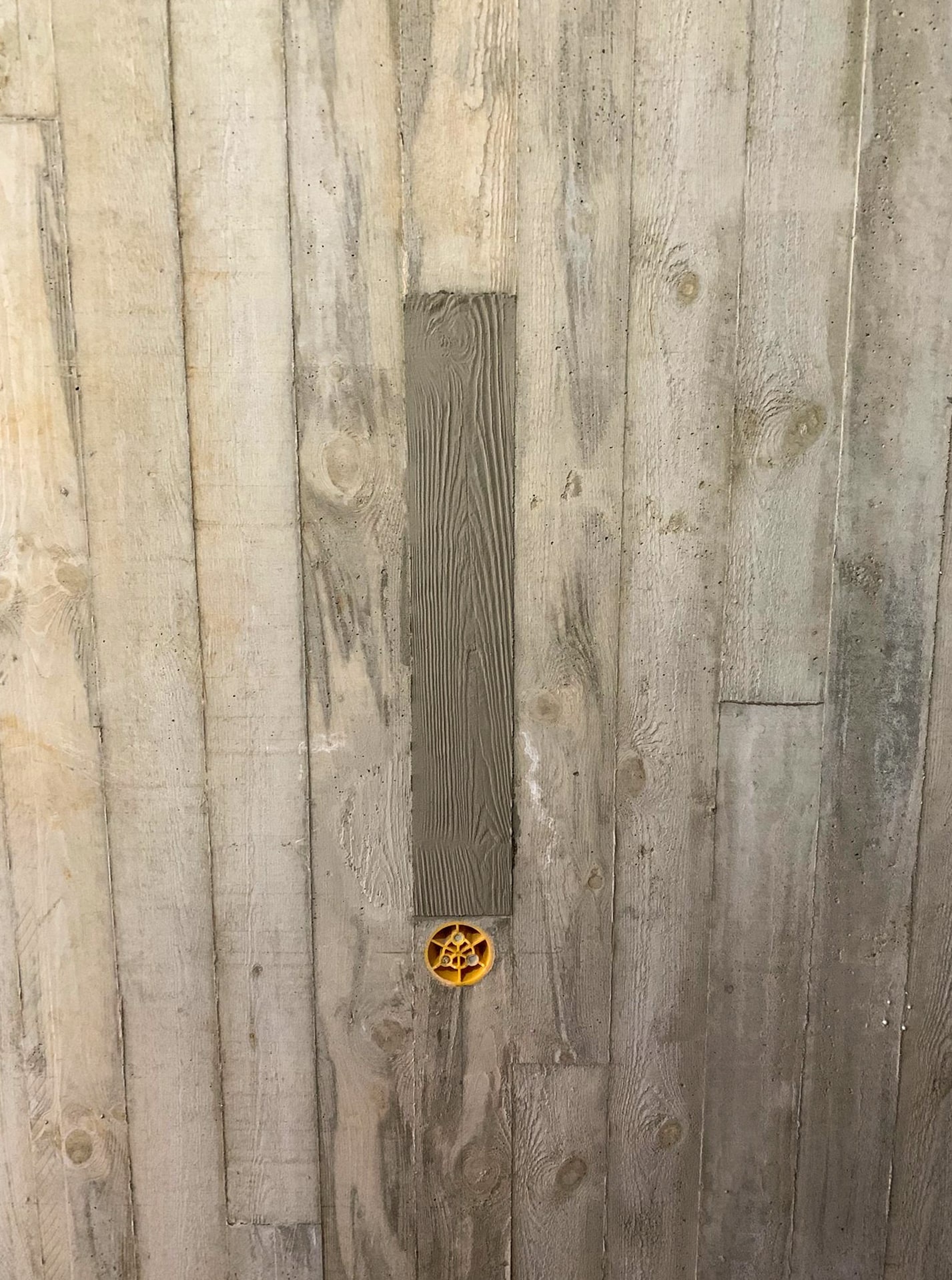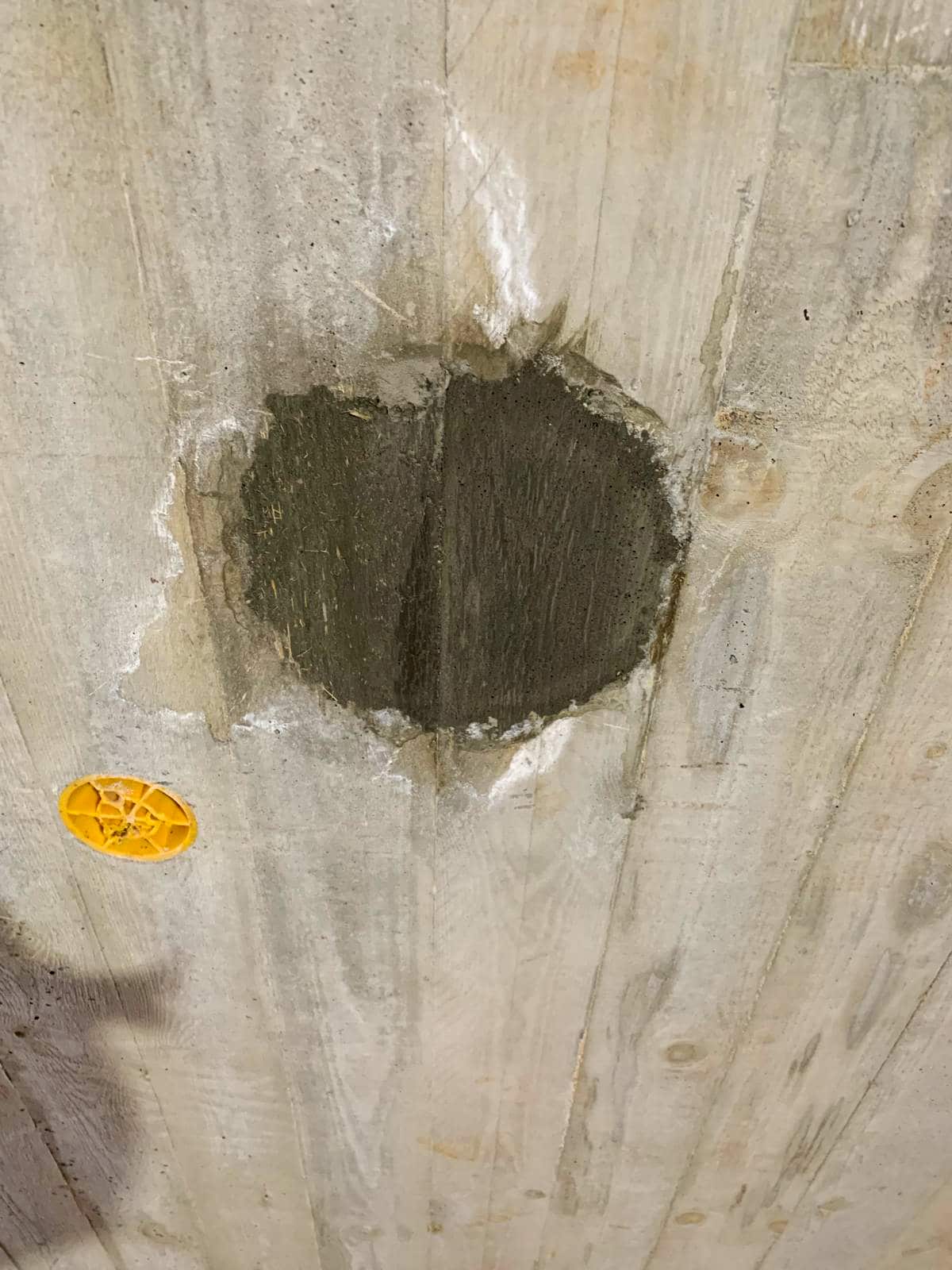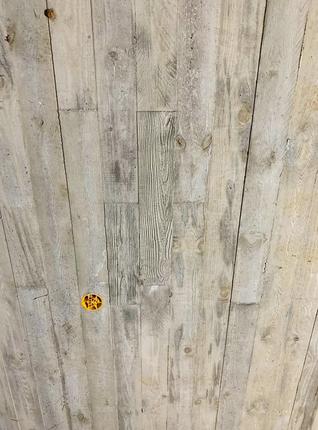 In Gent herstelden we het zichtbeton met plankenbekisting waar verschillende gaten en openingen zichtbaar waren. Tijdens de werken werden de ruwe boorgaten zorgvuldig uitgewerkt en voorbereid. Nadien brachten we de houtnerfstructuur opnieuw aan, zodat het plafond opnieuw één egaal en natuurlijk geheel vormt.